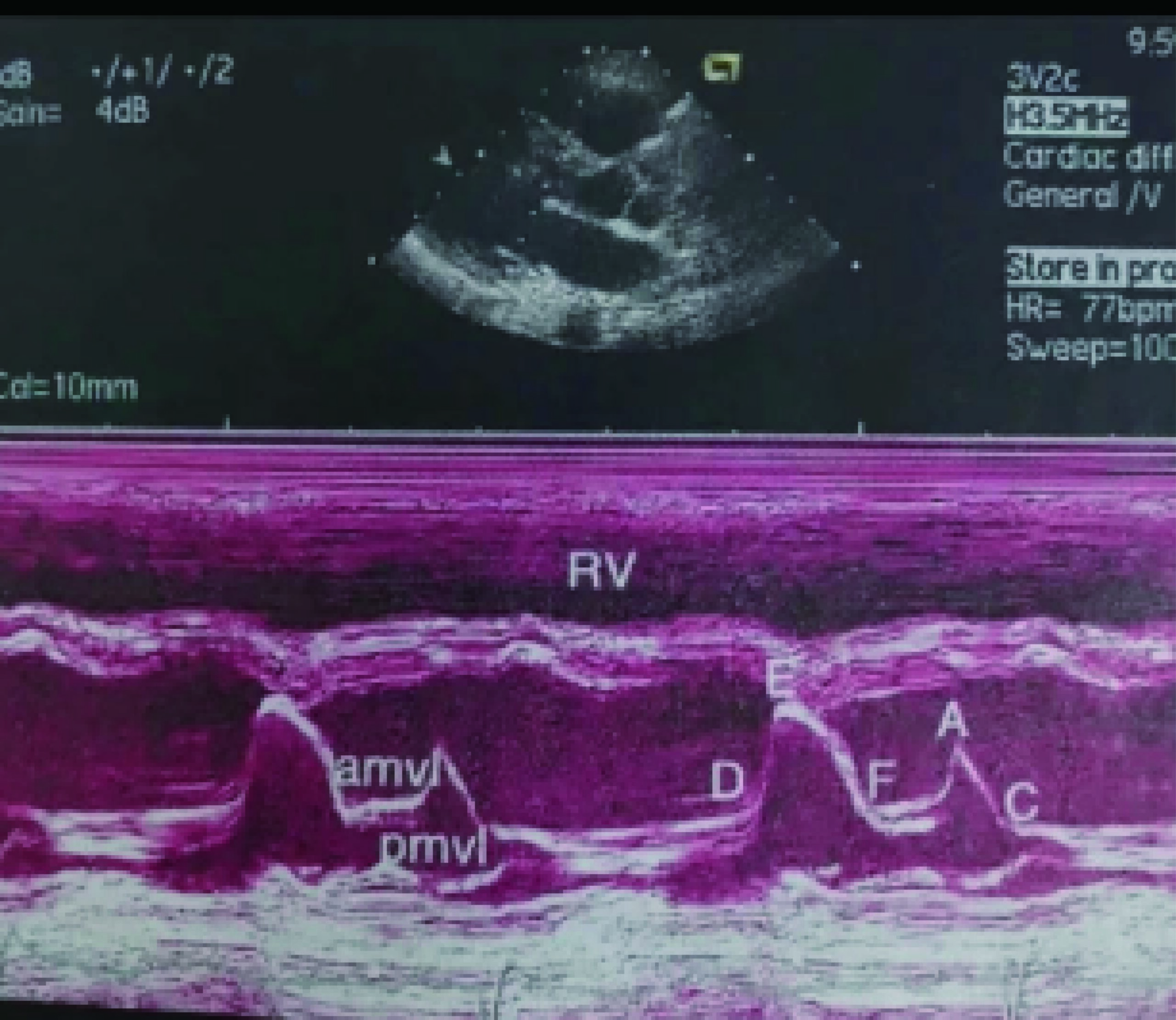 - F Point: The nadir after E wave descent; the descent velocity (EF slope) has a normal range of 80–120 cm/s. A decreased EF slope suggests elevated left ventricular end-diastolic pressure and impaired left atrial emptying.ABCDEF Points of the Anterior Mitral Leaflet Curve (Figure 4):